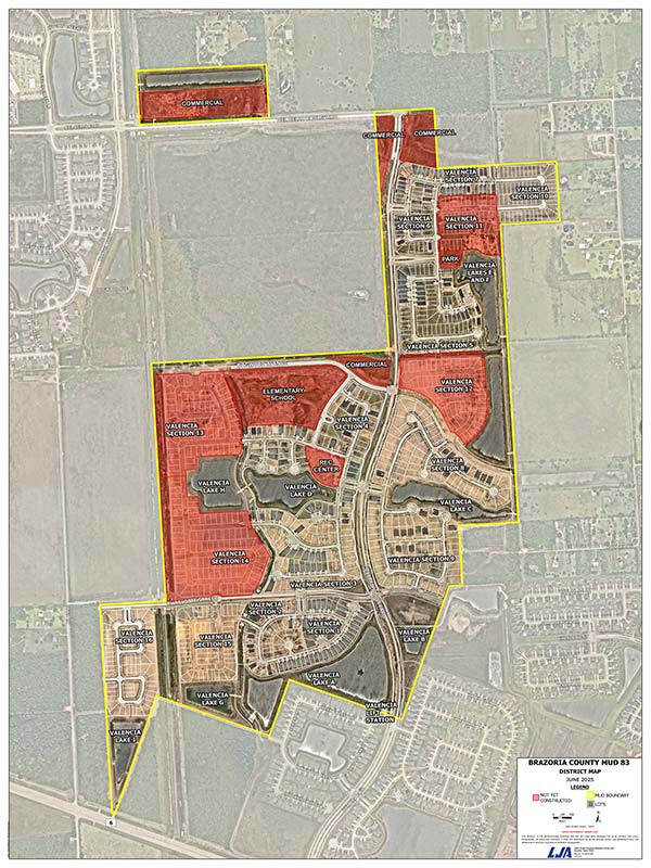 Brazoria County Municipal Utility District No. 83 (the “District”) was created and established pursuant to Senate Bill No. 1355 in the 87th Regular Session of the Texas Legislature, codified as Chapter 7922A, Special District Local Laws Code in accordance with Article XVI, Section 59 of the Texas Constitution effective May 24, 2021. Pursuant to the provisions of Chapters 49 and 54 of the Texas Water Code, the District is empowered to purchase, operate and maintain all facilities, plants, and improvements necessary to provide water, sanitary sewer service, storm sewer drainage, irrigation, roads, solid waste collection and disposal, including recycling, and to construct parks and recreational facilities for the residents of the District. The Board of Directors held its organizational meeting on September 15, 2021.The District is located within the City of Manvel, Texas (the “City”). All water, wastewater, drainage and road facilities will be conveyed to the City as constructed and placed in service. The rights and obligations to operate water, wastewater, drainage and road facilities for the benefit of the residents of the District have been conveyed to the City of Manvel, Texas pursuant to an agreement. The District currently consists of 437.869 acres and serves the Valencia community.